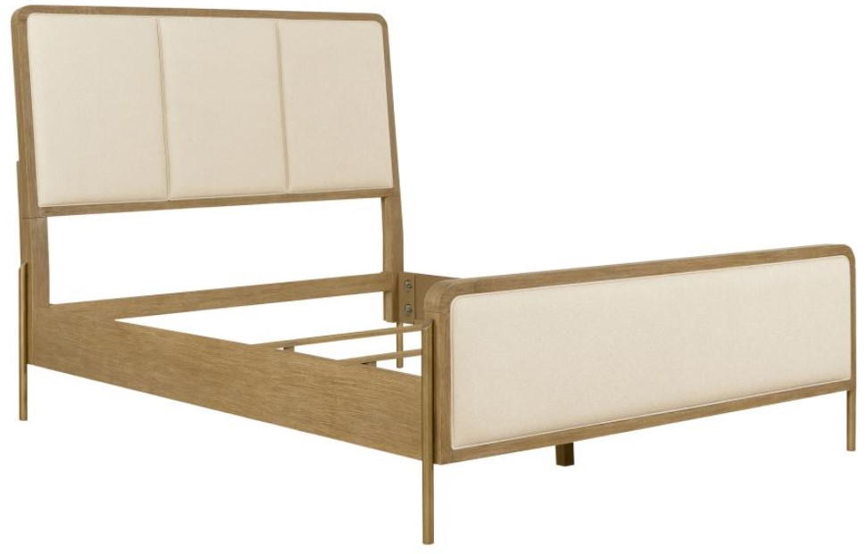 Elevate your coastal bedroom with this stunning panel bed, designed with retro-inspired elements and luxurious details. Cream fabric upholstery on the headboard and footboard is framed by a sleek black edge, creating a bold contrast and soft texture. The aged brass metal legs introduce a metallic accent that enhances its glamorous appeal.Read More