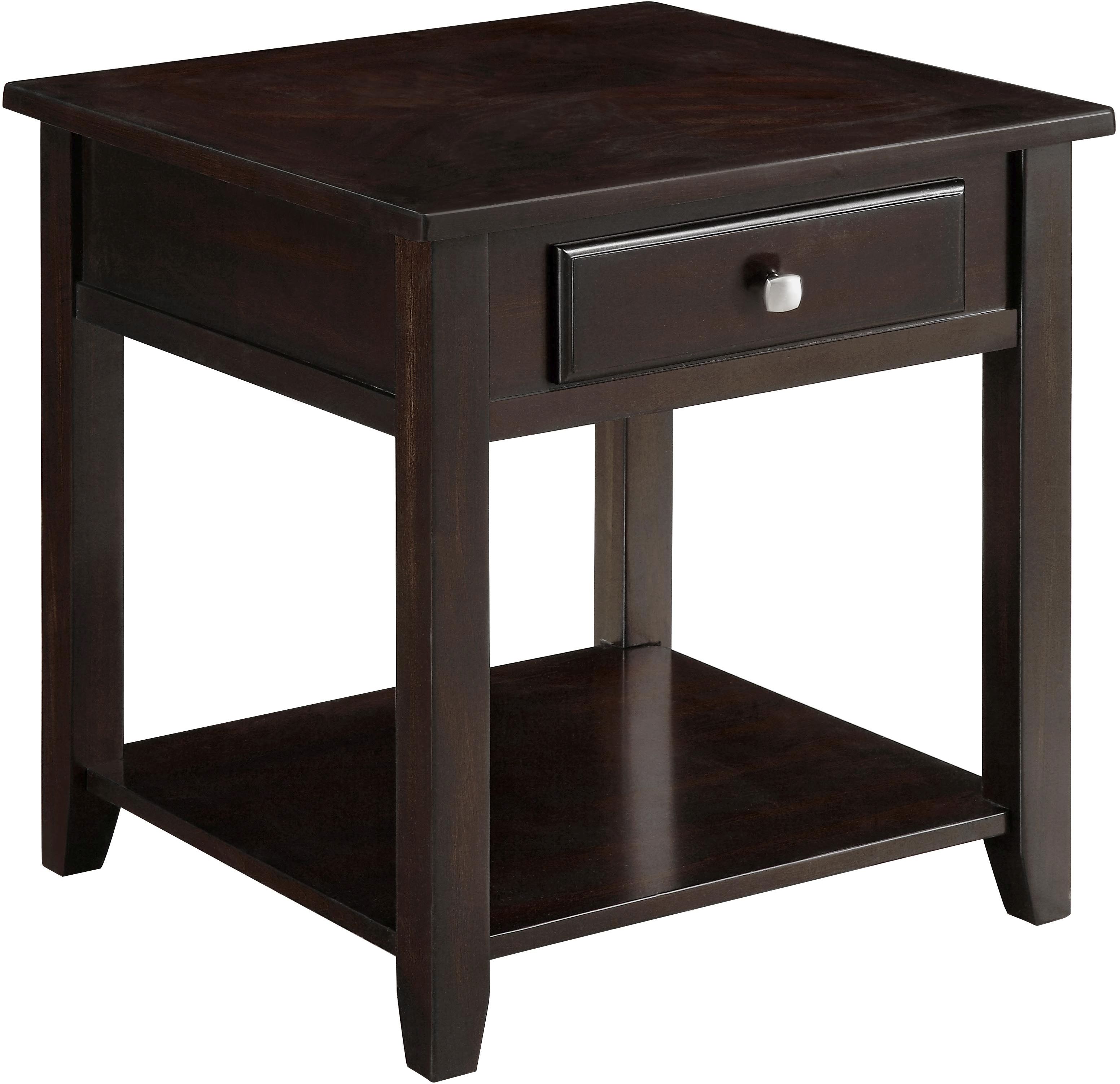 Sleek and stunning, this classic wood end table is full of clean lines. With smooth edges, the silhouette features one drawer with bright metallic hardware. In a walnut finish, the rich hues add depth next to any sofa.Read More