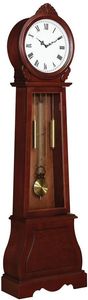 Stately grandfather clock in brown red finish with gold finish details features striking bishop silhouette